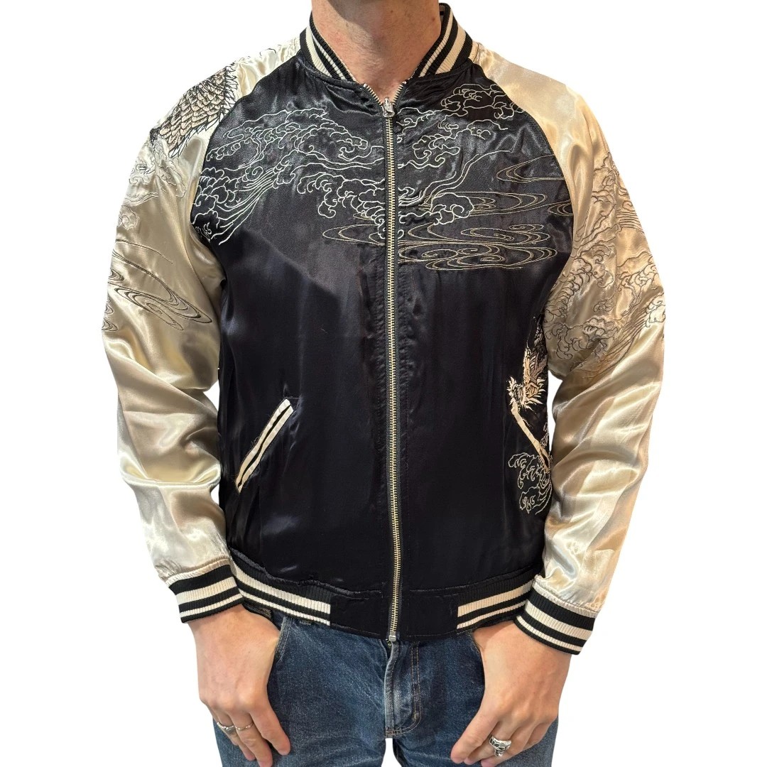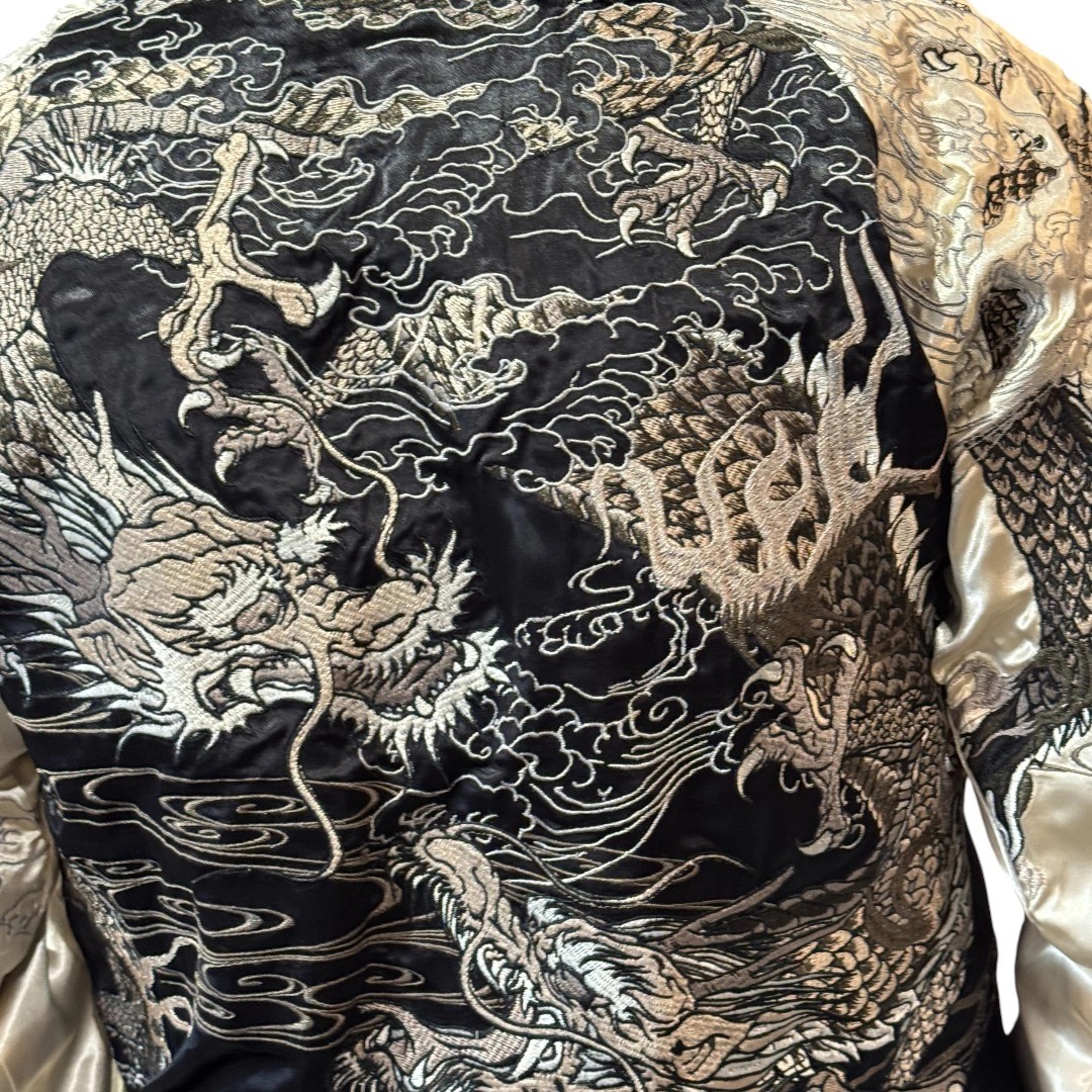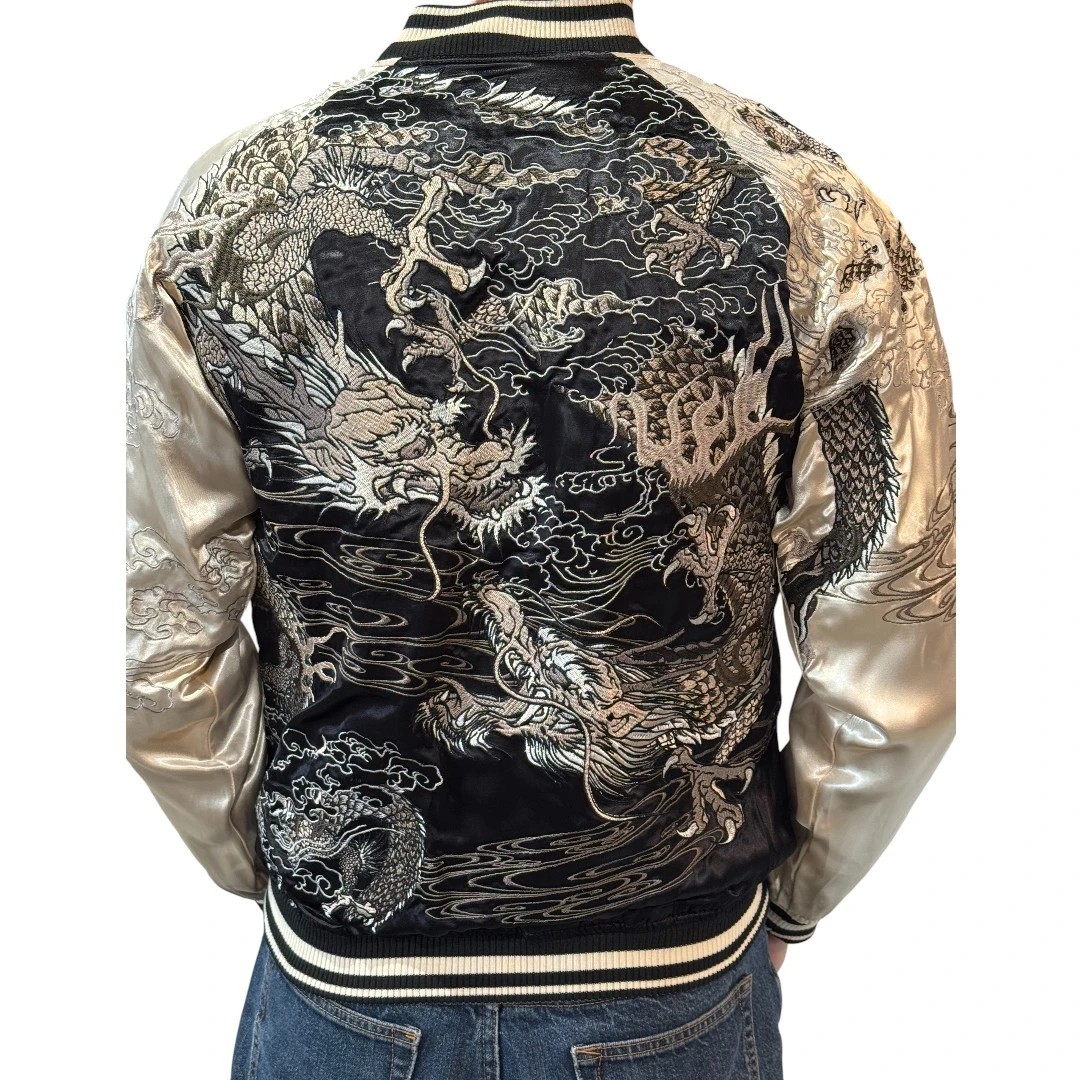 Cette veste Sukajan Combat des Dragons Argentés est une pièce d’exception inspirée du style traditionnel japonais. Sur la face principale, deux dragons argentés se font face, leurs corps s’étendant sur les manches pour un effet visuel puissant et dynamique. Les broderies sont riches, détaillées et délicatement contrastées par un fond noir et des manches dorées.