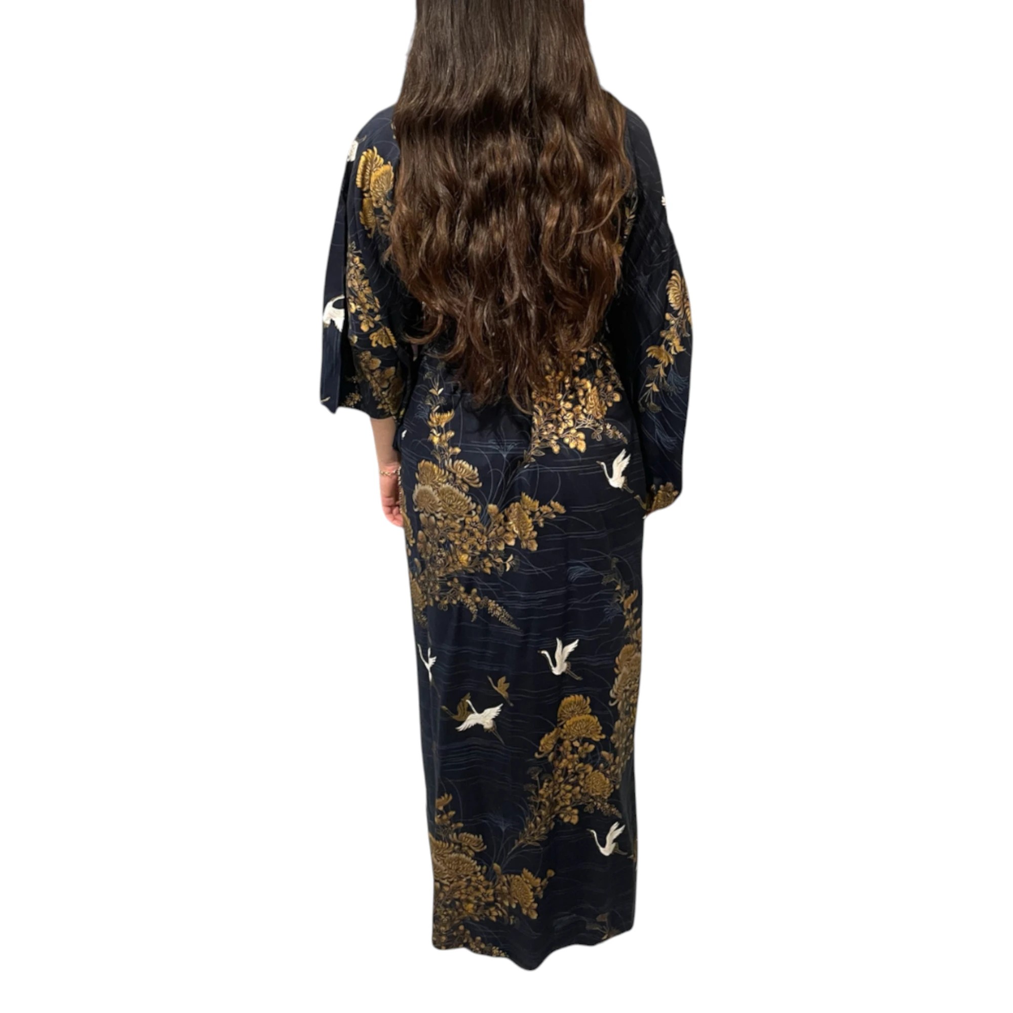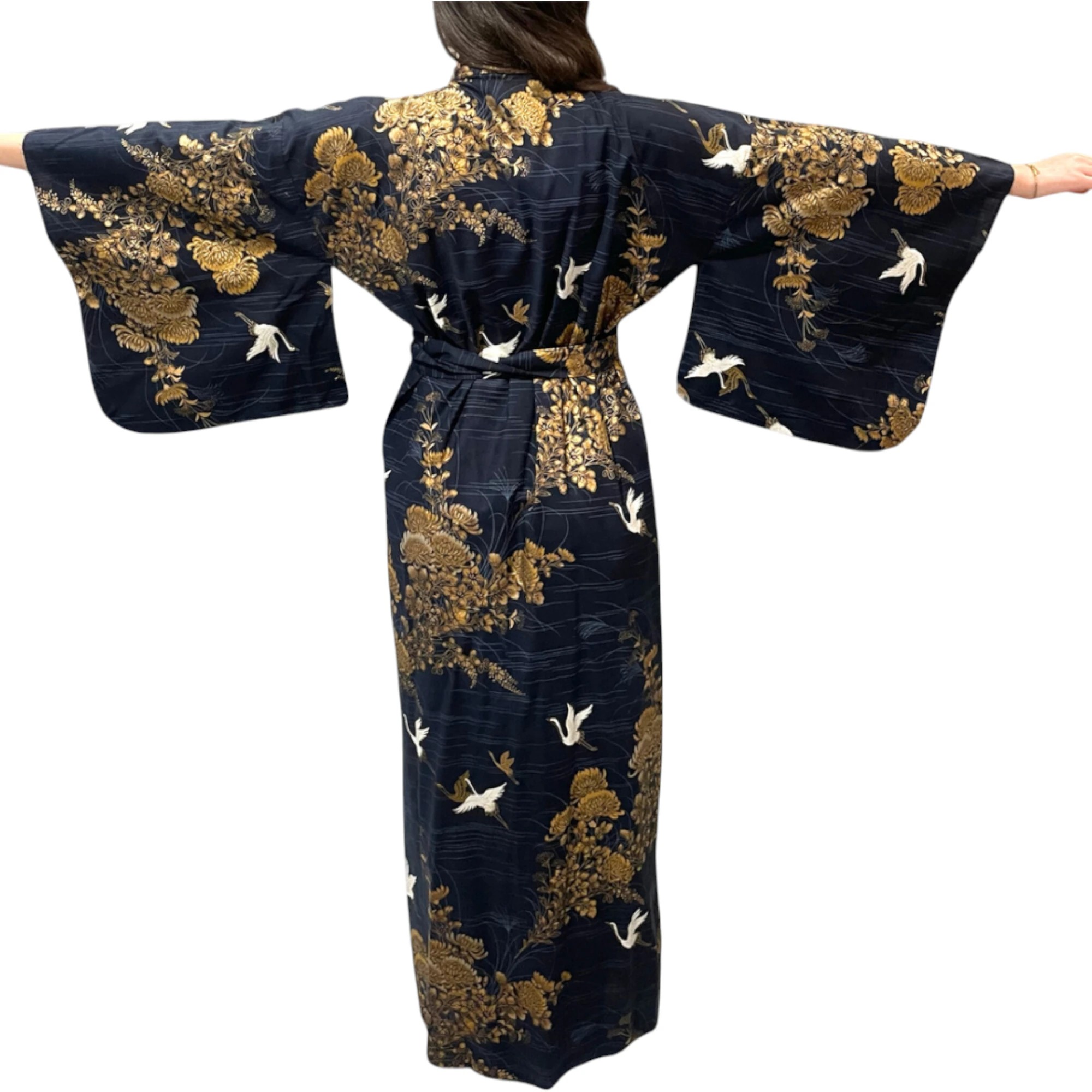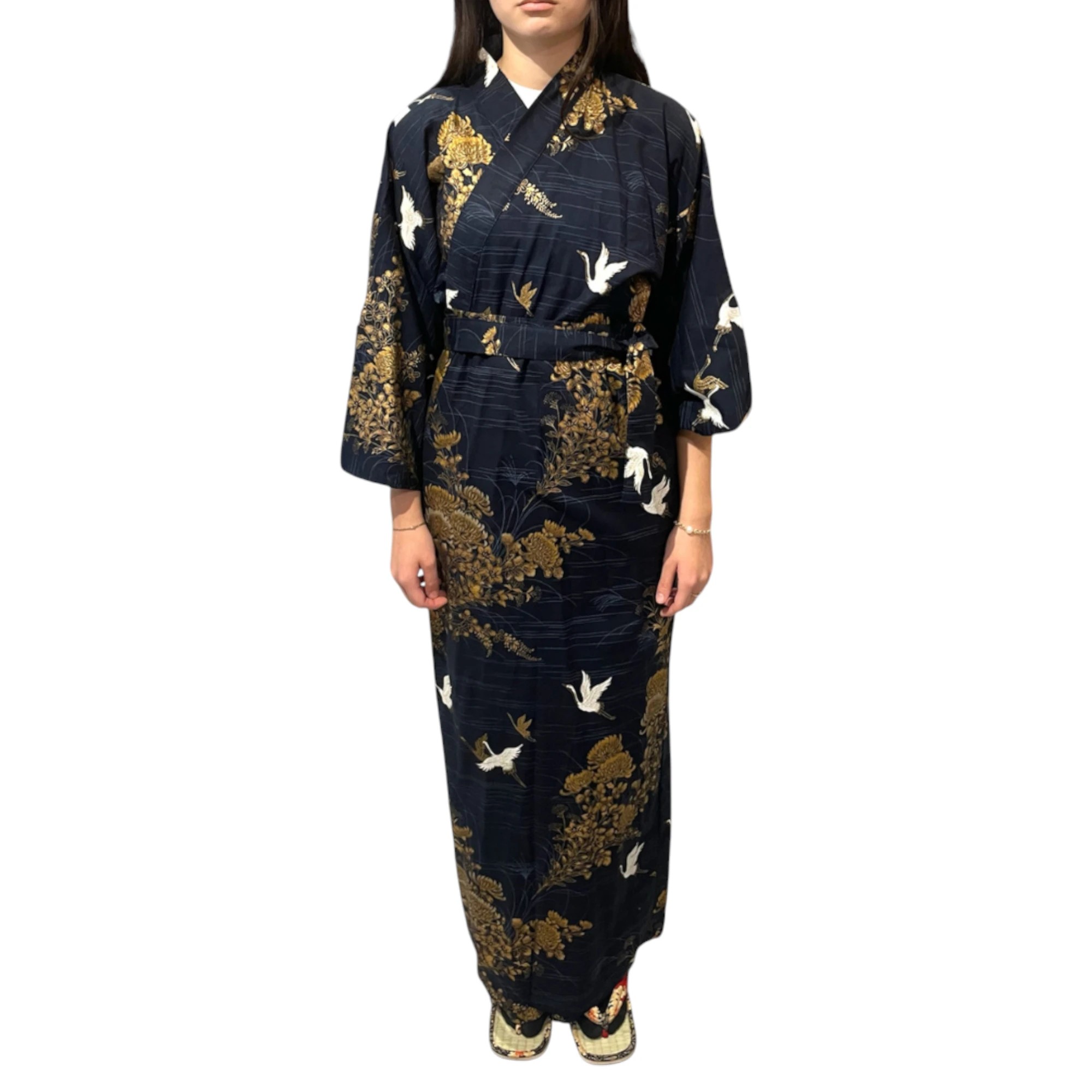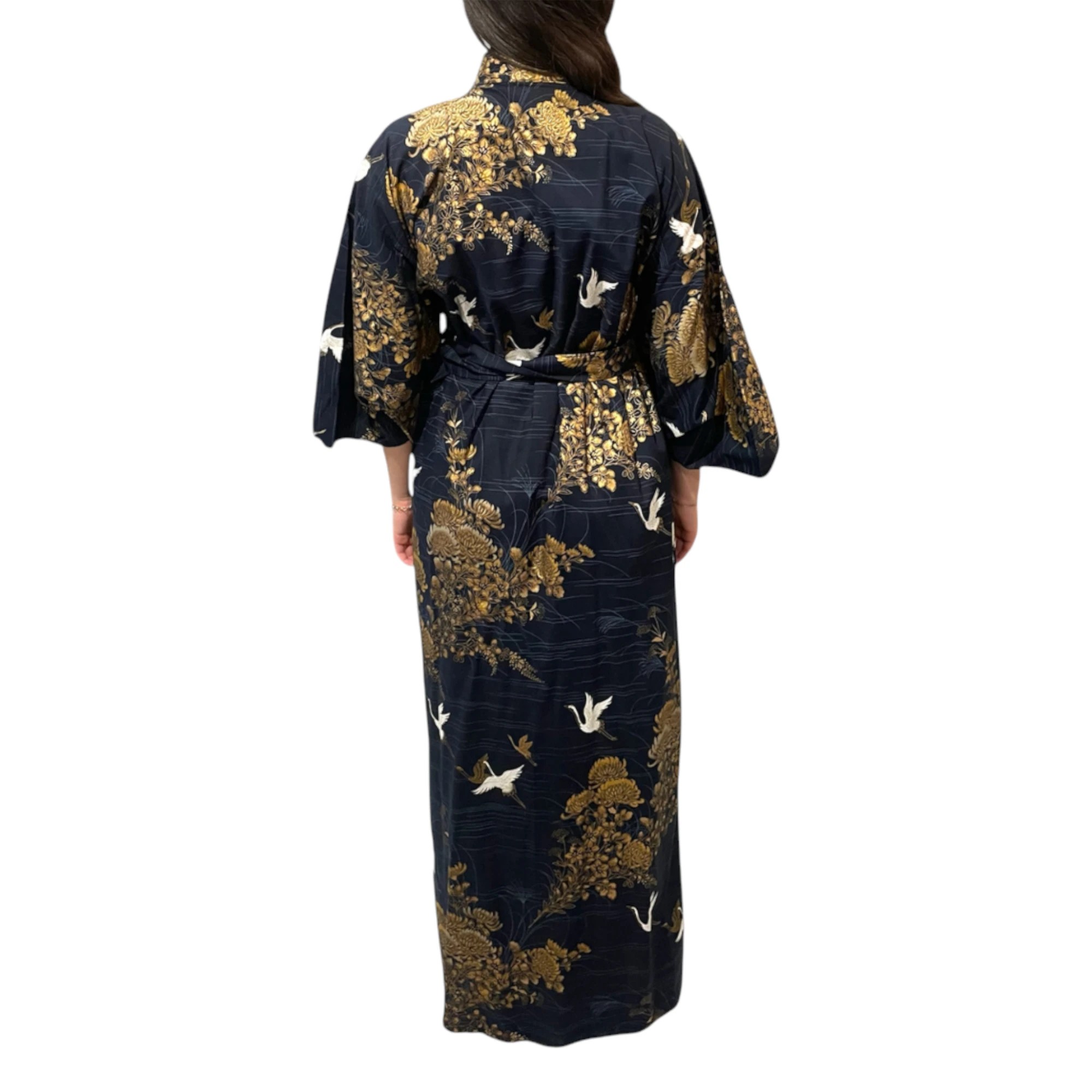 Plongez dans l’élégance japonaise avec ce yukata long pour femme, confectionné à Kyoto à partir de 100 % coton de haute qualité. Ce modèle noir raffiné est décoré de motifs traditionnels de grues et de paysages naturels, symboles de longévité, d’harmonie et de bonheur dans la culture japonaise.