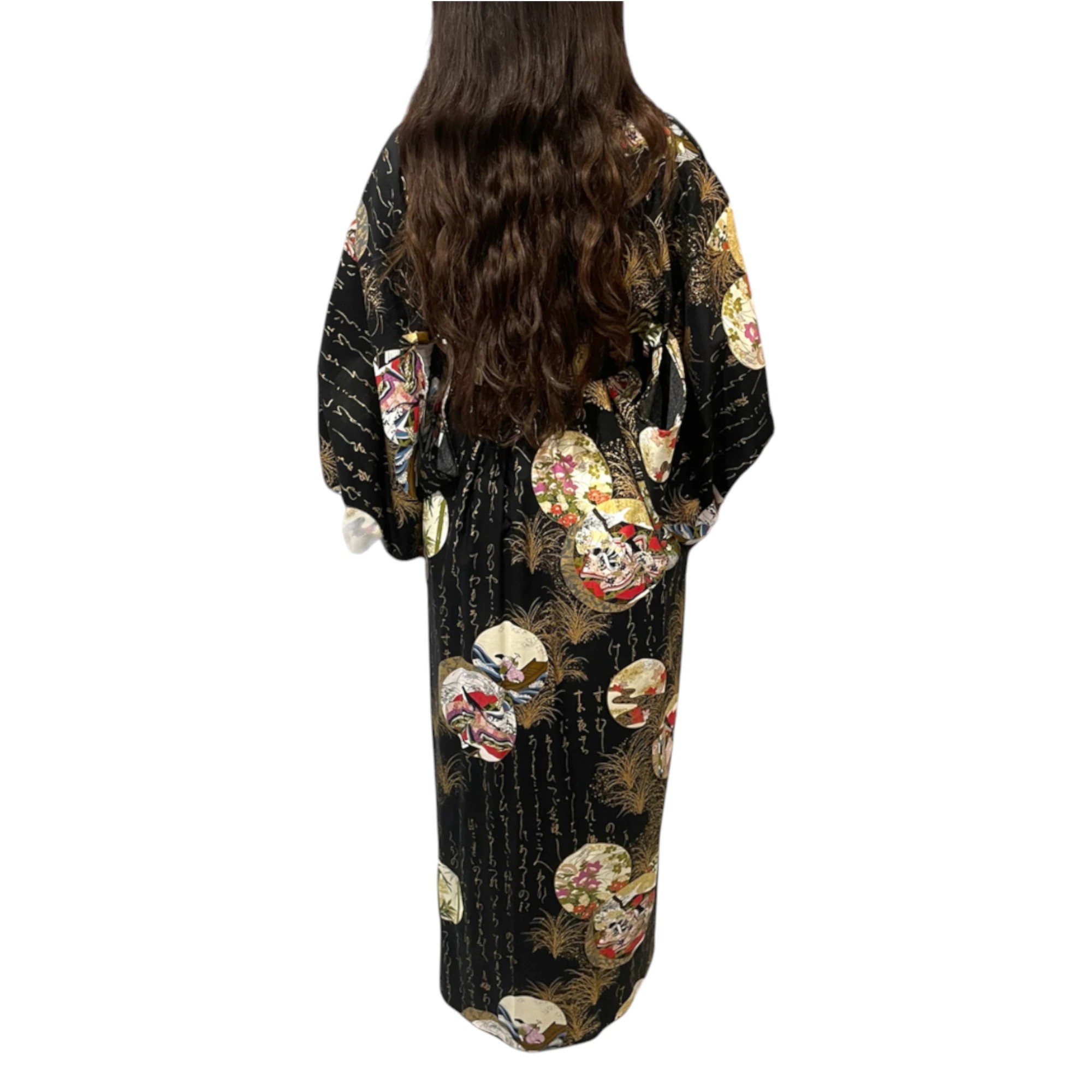 Offrez-vous une touche d’élégance japonaise avec ce yukata japonais long pour femme en coton noir, décoré de motifs de kanji et de personnages. Fabriqué à Kyoto, au Japon, ce vêtement traditionnel s’adapte parfaitement à un usage à la maison comme peignoir ou kimono d’intérieur.