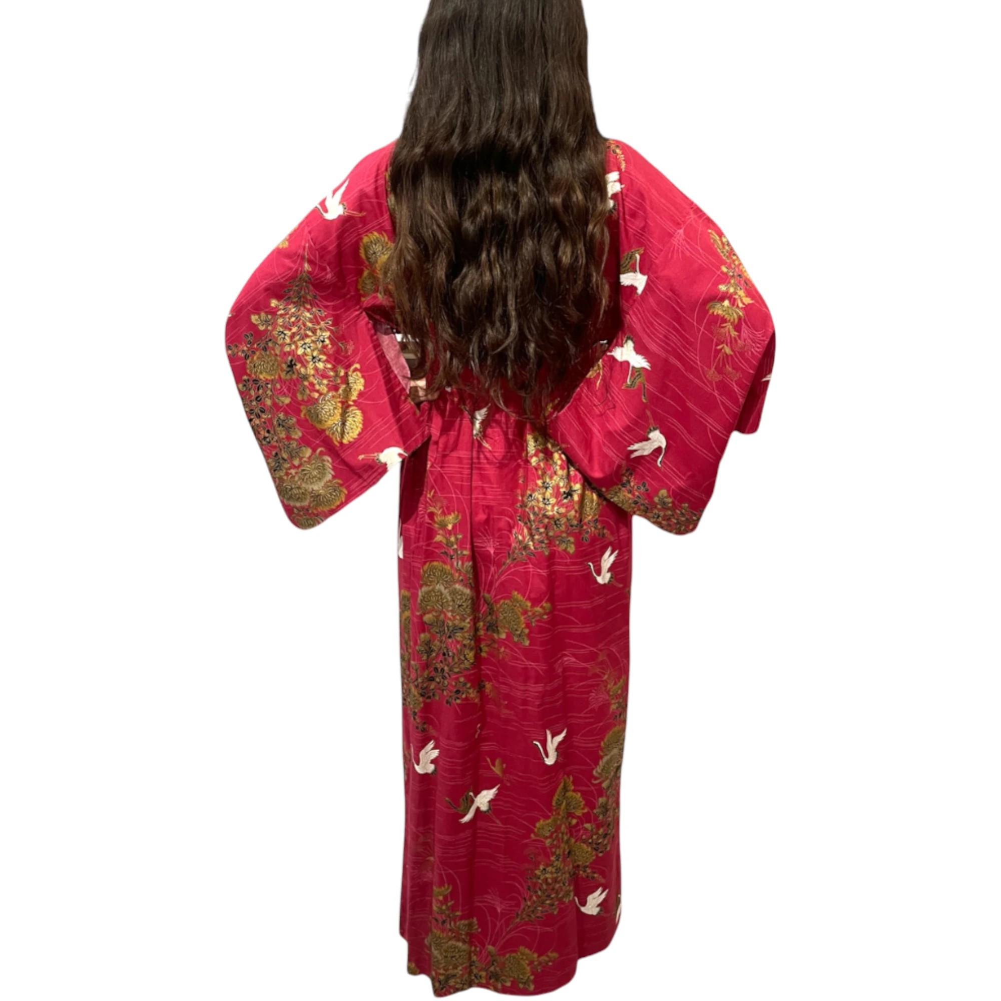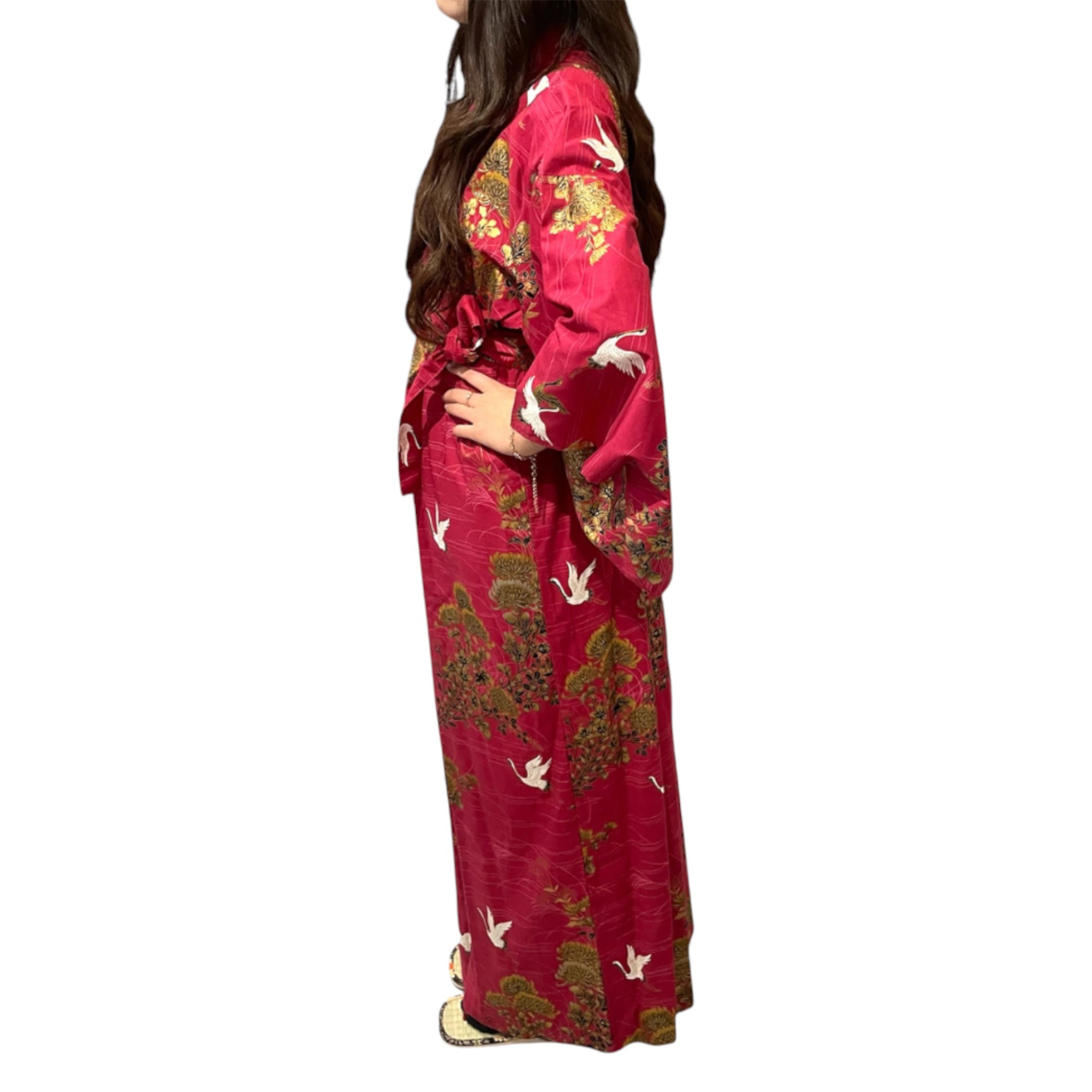 Découvrez l’élégance intemporelle du yukata japonais pour femme en coton rouge, décoré de motifs traditionnels de grues et de fleurs. Ce kimono long est un vêtement d’intérieur parfait pour celles qui souhaitent allier raffinement et confort.