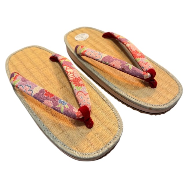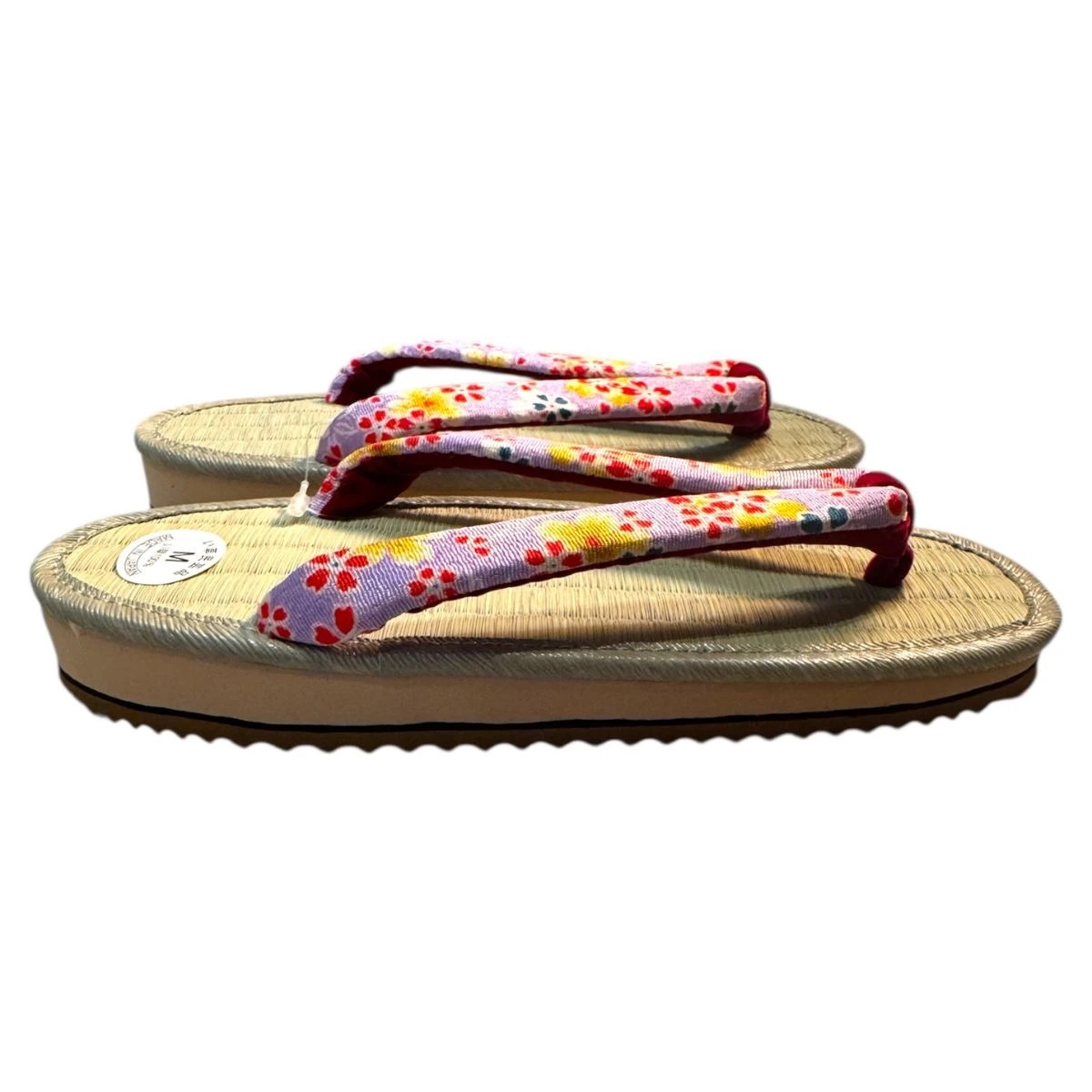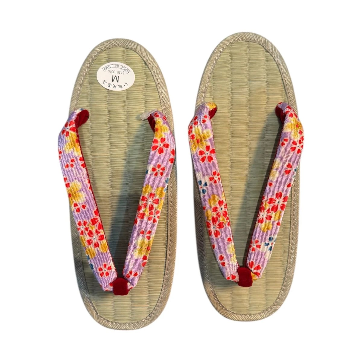 Ces zori japonaises pour femme allient confort, tradition japonaise et élégance au quotidien. Conçues à la main au Japon, elles possèdent un paillage de riz naturel qui épouse progressivement la forme de vos pieds, offrant une sensation de marche légère et agréable. La lanière en coton mauve ornée de motifs de fleurs apporte une touche raffinée qui s’harmonise facilement avec un yukata, un kimono d’été ou une tenue moderne.