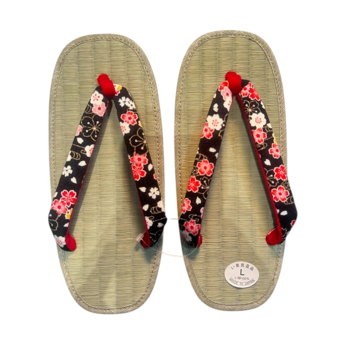 Ces zori japonaises pour femme allient confort, tradition et finesse. Fabriquées et assemblées à la main au Japon, elles offrent une marche agréable grâce à leur paillage de riz naturel et leur semelle antidérapante en caoutchouc. Leur lanière en coton noir décorée de motifs Sakura apporte une touche élégante, idéale pour accompagner un yukata ou être portées au quotidien avec nos chaussettes tabi.